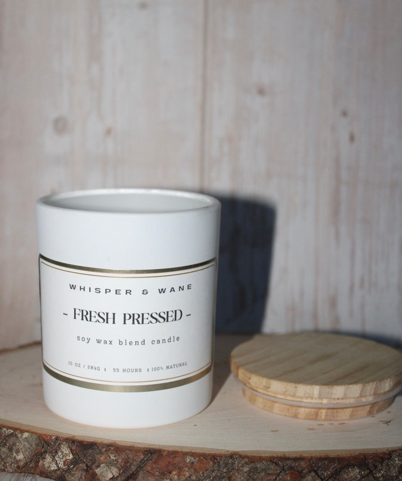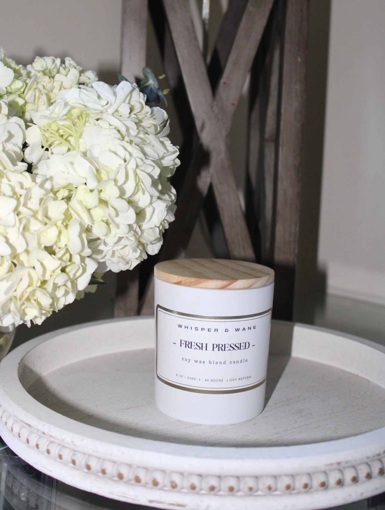 Fresh Pressed is the scent of a freshly cleaned space—bright, airy, and effortlessly refreshing. It captures the feeling of sun-warmed linens, a gentle breeze, and that just-finished tidy-up glow. Clean, crisp, and subtly warm, it’s the perfect everyday scent to make any room feel renewed.
